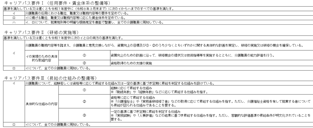 上記のうち、④の見える化要件とは介護職員等処遇改善加算の取得状況と賃金改善以外の処遇改善に関する具体的な取組内容を、自社のホームページ等を活用して公表していることとされております。